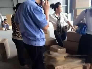 現(xiàn)場仍然有部分貨物未運走,保安人員對著包裝盒上的電話,聯(lián)系廠家?guī)县涍\單前來認領(lǐng)。