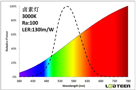 上面圖中,我們可以看到鹵素?zé)舻墓庖曅埽↙ER)只有130lm/W,也就是說(shuō)鹵素?zé)衾碚撋系淖罡吖庑茏?30lm/W,主要是鹵素?zé)舻墓庾V里面包含了大量的紅光,從視見函數(shù)V(λ)(黑色虛線所示)上看,這些紅光人眼都是不敏感的,導(dǎo)致光視效能(LER)比較低。