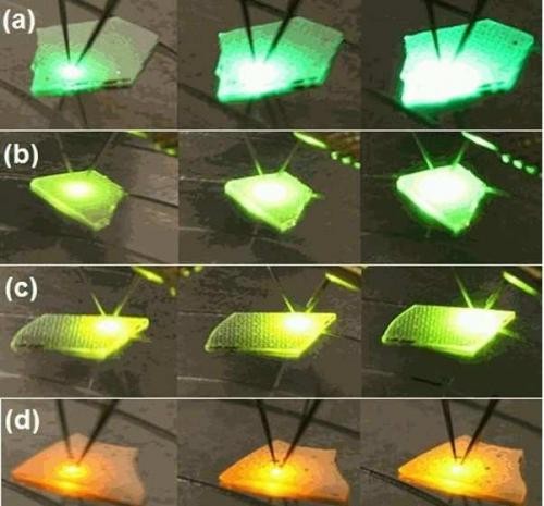 分別在5mA、20mA與100mA時(shí)拍攝的(a)綠(b)黃綠(C)黃(d)琥珀色LED電致發(fā)光圖