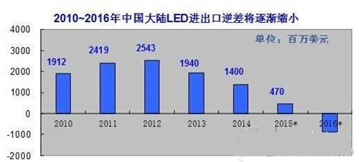 從LED進(jìn)出口貿(mào)易發(fā)展趨勢(shì)看,2015年的貿(mào)易逆差將縮小到4.7億美元,到2016年將出現(xiàn)貿(mào)易順差約9億美元(參見(jiàn)下圖)。