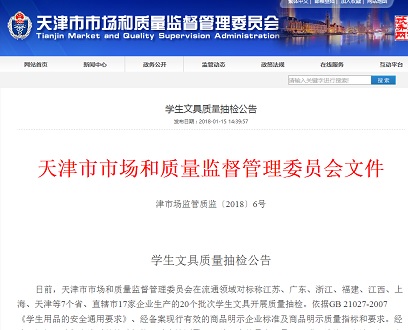 據(jù)天津市市場和質(zhì)量監(jiān)督管理委員會官網(wǎng)2018年1月15日消息,日前,天津市市場和質(zhì)量監(jiān)督管理委員會在流通領(lǐng)域?qū)?biāo)稱江蘇、廣東、浙江、福建、江西、上海、天津等7個省、直轄市17家企業(yè)生產(chǎn)的20個批次學(xué)生文具開展質(zhì)量抽檢。其中,1個批次邊緣、尖端指標(biāo)不合格。