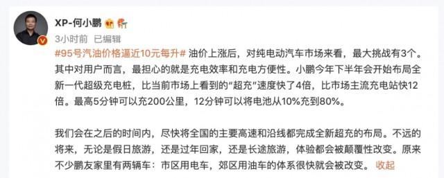 在上個(gè)月小鵬汽車發(fā)布了 2022 年第一季度財(cái)報(bào)。財(cái)報(bào)顯示,截至4月30日,小鵬自營充電網(wǎng)絡(luò)已累計(jì)上線954座,,其中包含 774 個(gè)自營超充站以及 180 個(gè)目的地充電站,覆蓋中國所有直轄市和地級(jí)行政區(qū)。何小鵬表示,隨著 G9 大規(guī)模交付,小鵬汽車從今年四季度起大規(guī)模部署下一代超充,從 180kW 充電樁直接升級(jí)到 480kW 超充電樁,實(shí)現(xiàn)充電 5 分鐘續(xù)航 200 公里的補(bǔ)能體驗(yàn)。