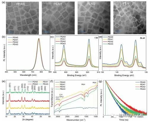 圖1:a) 不同PEAI濃度處理的FAPbI3量子點的TEM圖像、b)XRD圖譜、c、d)XPS光譜、e)PL光譜、f)FTIR光譜和g)TRPL衰減曲線。