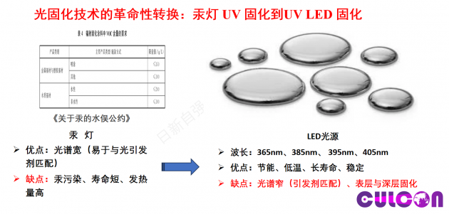 汞燈 UV 固化到UV LED 固化是光固化技術(shù)的革命性轉(zhuǎn)換。并指出LED固化在航空工業(yè)(光引發(fā)前線聚合、隱身涂層和復(fù)合材料)、汽車工業(yè)、機(jī)車工業(yè)、新能源(鋰電池、風(fēng)力發(fā)電、光伏)、卷鋼和印鐵行業(yè)中都將有不錯(cuò)的拓展應(yīng)用。