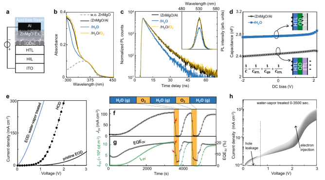 高導電性電子注入層:通過原位還原處理,將ZnMgO納米晶EIL的電子電導率提升1000倍,實現(xiàn)歐姆傳輸和高效空穴阻擋,顯著改善QLED性能。